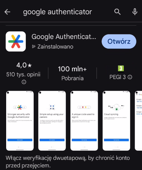 3. Możesz też na telefonie z Android otworzyć Sklep Play i wyszukać google authenticator i zainstalować aplikację