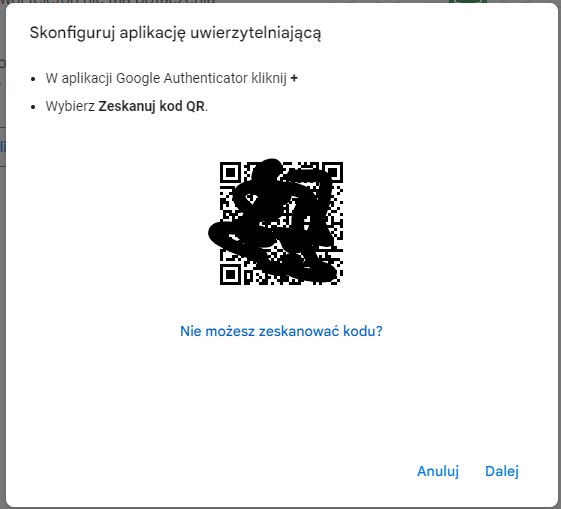 5. Pojawi się okienko Skonfiguruj aplikację uwierzytelniającą na którym będzie widoczny kod QR