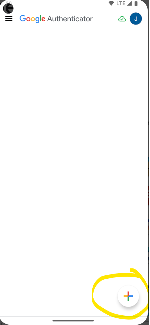 3. Na telefonie otwórz aplikację Google Authenticator. Jeśli to konieczne przejdź przez ekrany powitalne, aż pojawi się ekran z przyciskiem + na dole.
