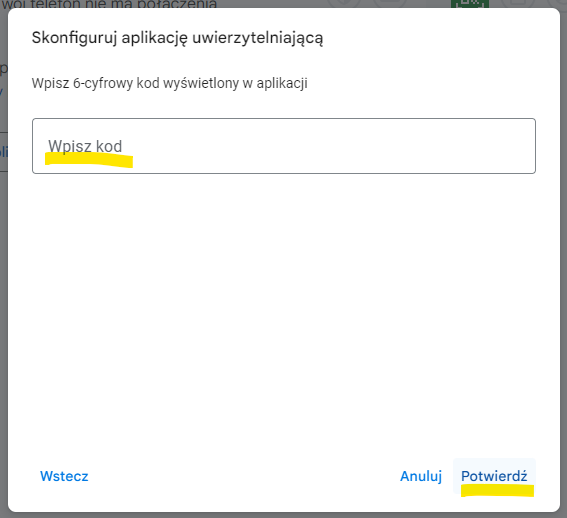 4. Pojawi się okienko do wpisania kodu. Wpisz w nie 6 cyfr które się wyświetlają w aplikacji na telefonie i naciśnij Potwierdź.