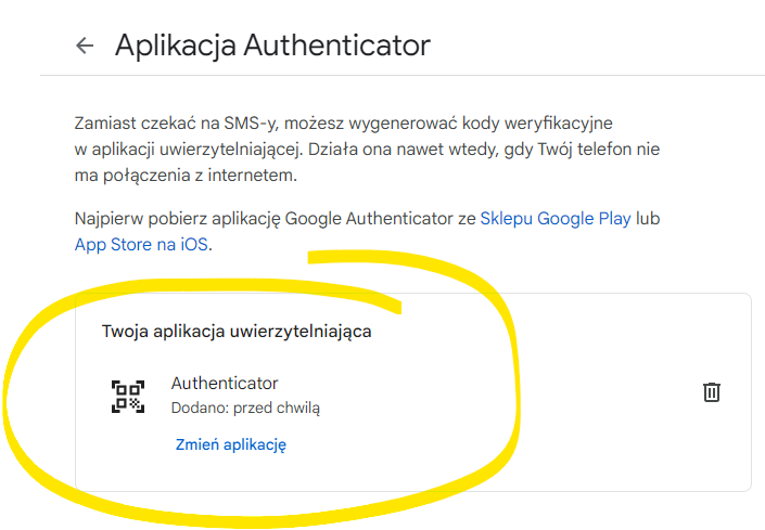 Gdy kod będzie poprawny pojawi się okienko z informacją: Twoja aplikacja uwierzytelniająca Authenticator