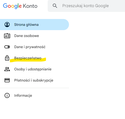 5. w menu po lewej kliknij Bezpieczeństwo