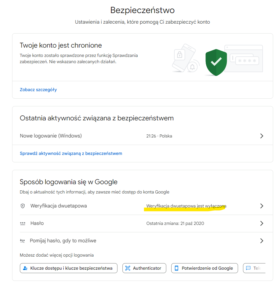 7. Znajdź sekcję Sposób logowania się w Google i kliknij Weryfikacja dwuetapowa jest wyłączona
