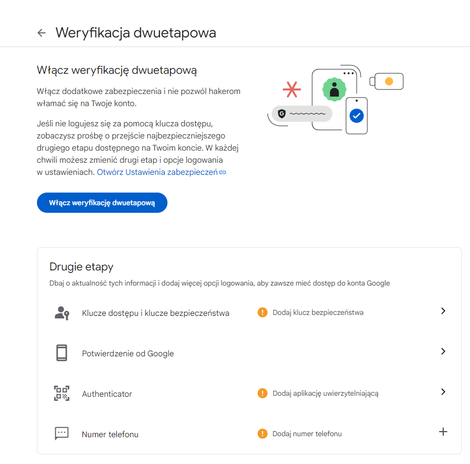 8. Pojawi się strona Weryfikacja dwuetapowa na której możesz dodać różne sposoby weryfikacji (Drugie etapy).