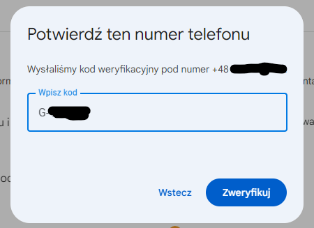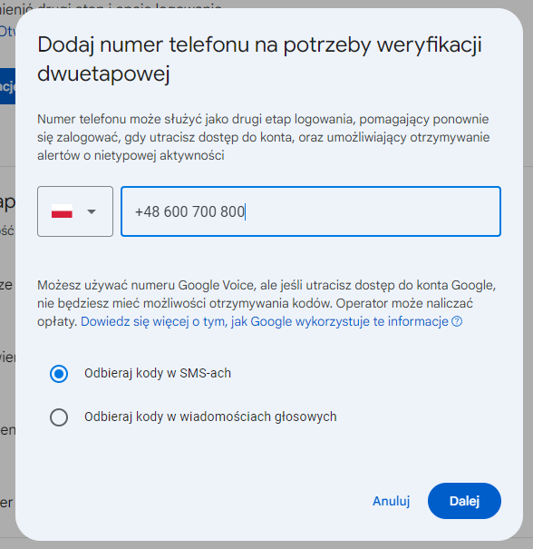 2. Pojawi się okienko Dodaj numer telefonu na potrzeby werfyikacji dwuetapowej w którym: