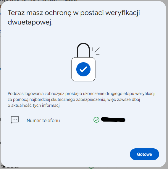 Po włączeniu drugiego etapu weryfikacji pojawi się okienko Teraz masz ochronę w postaci weryfikacji dwuetapowej wraz z informacją o włączonych dodatkowych weryfikacjach